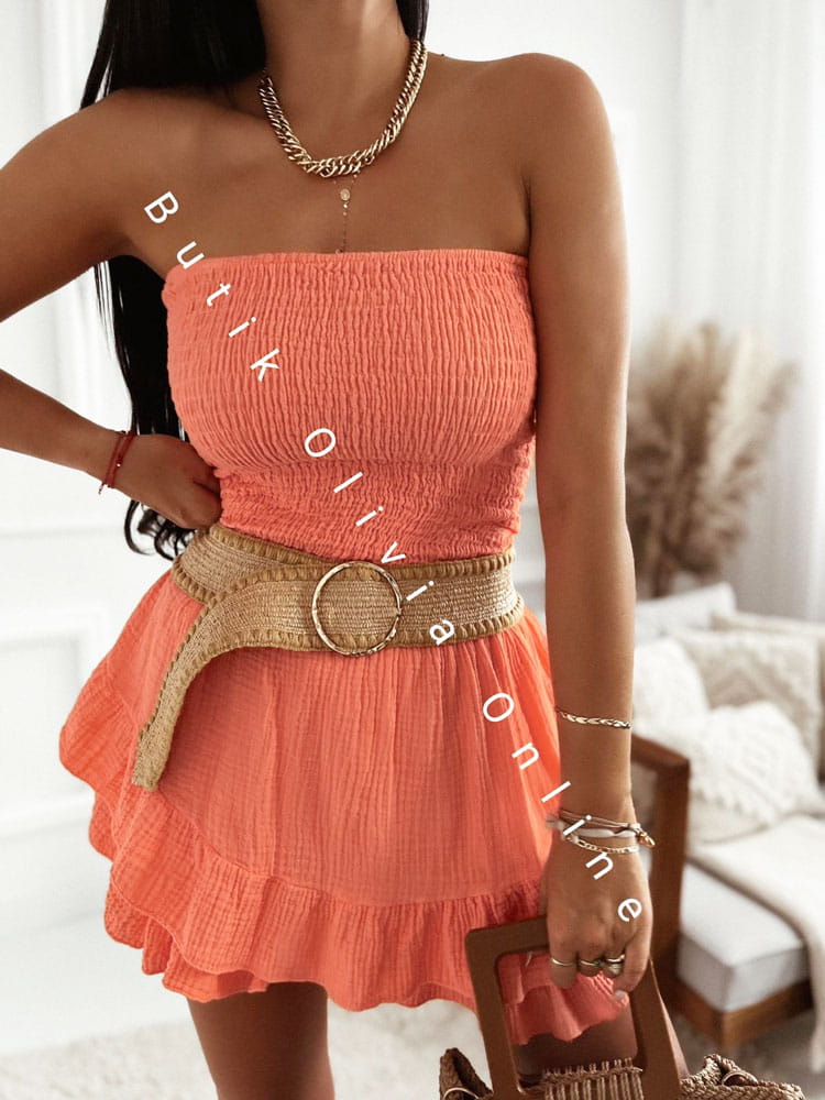 Der Damen-Musselin-Overall in modischer Neonfarbe ist die perfekte Wahl für den Sommer. Aus leichtem, atmungsaktivem Material gefertigt, eignet er sich ideal für heiße Tage. Das Modell im Carmen-Stil mit elastischem, gerafftem Oberteil betont schön Schultern und Dekolleté, während der ausgestellte Unterteil mit Volant der Silhouette Leichtigkeit und femininen Charme verleiht. Dieser Sommer-Overall für Damen vereint Stil und Komfort. Integrierte Shorts sorgen für volle Bewegungsfreiheit und angenehmen Tragekomfort im Alltag. Der Overall ist ideal für den Strand, Spaziergänge sowie sommerliche Ausflüge oder Urlaubsreisen. Die Neonfarbe sticht aus klassischen Looks hervor und verleiht jedem Outfit Frische und Ausdruck. Orange auf pinkem Hintergrund.