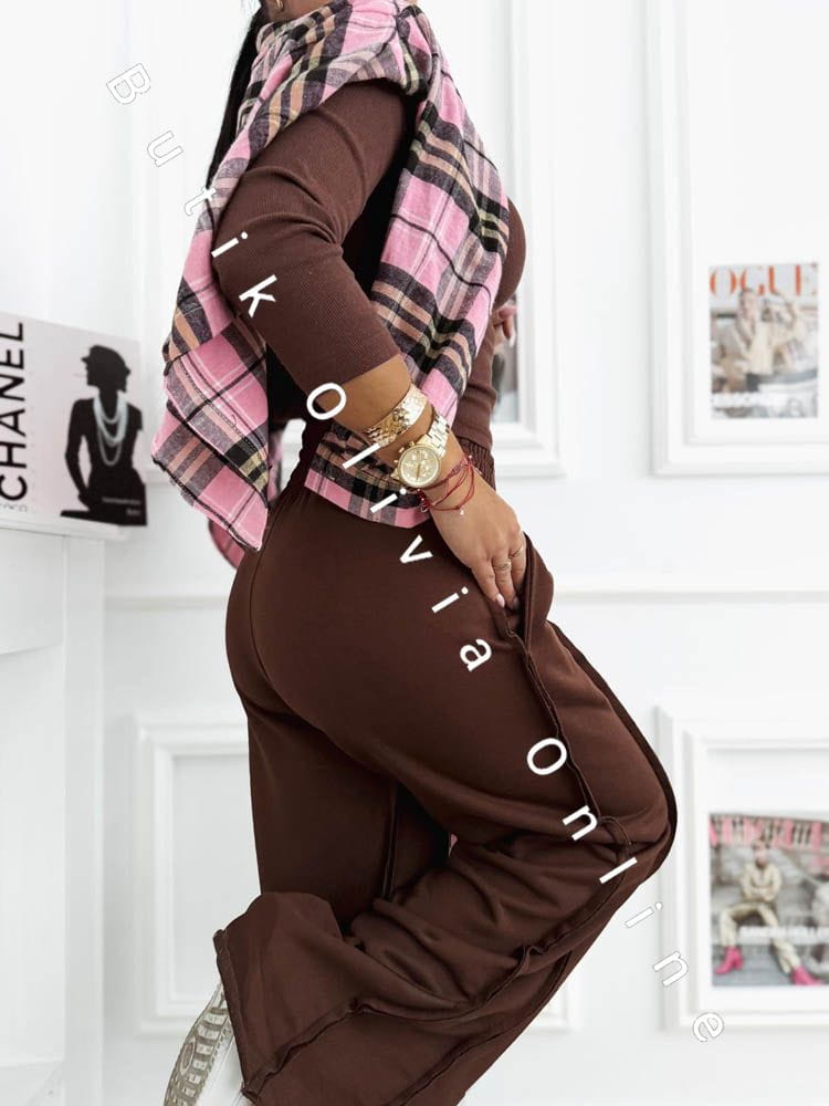 Geripptes Blusen-Set mit weiter Hose VIGO – Schokoladenbraun