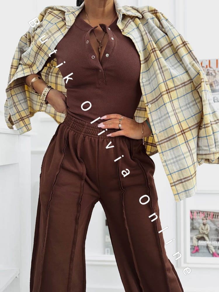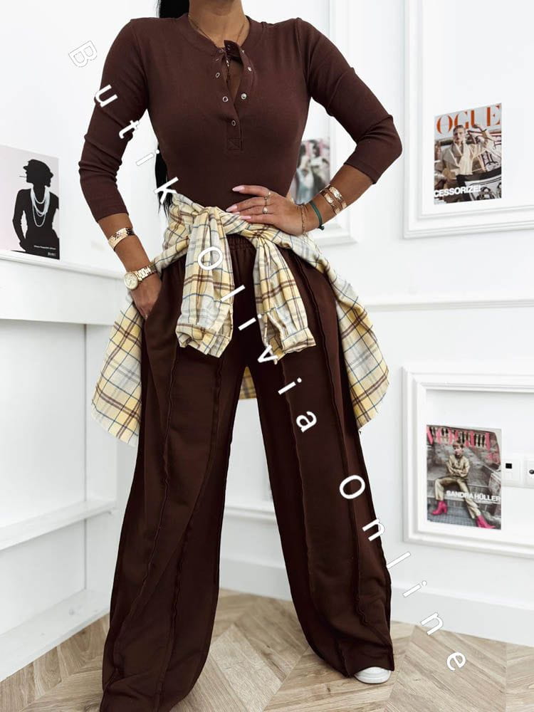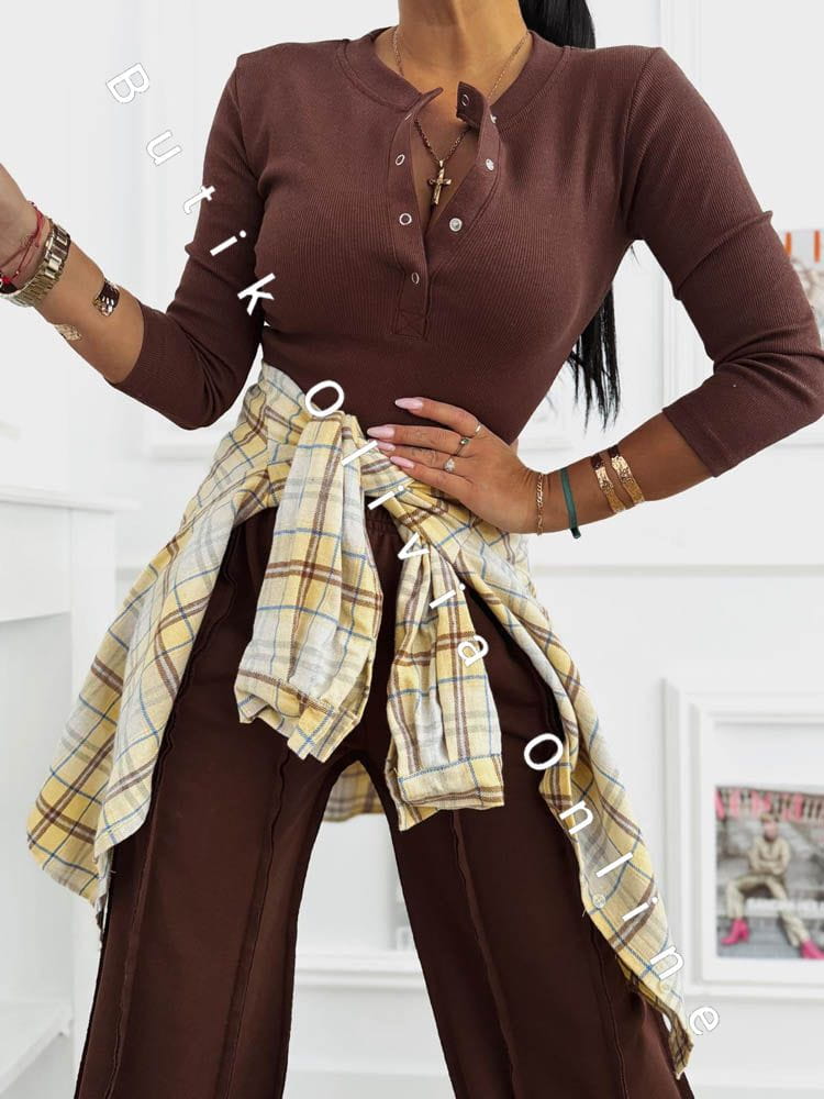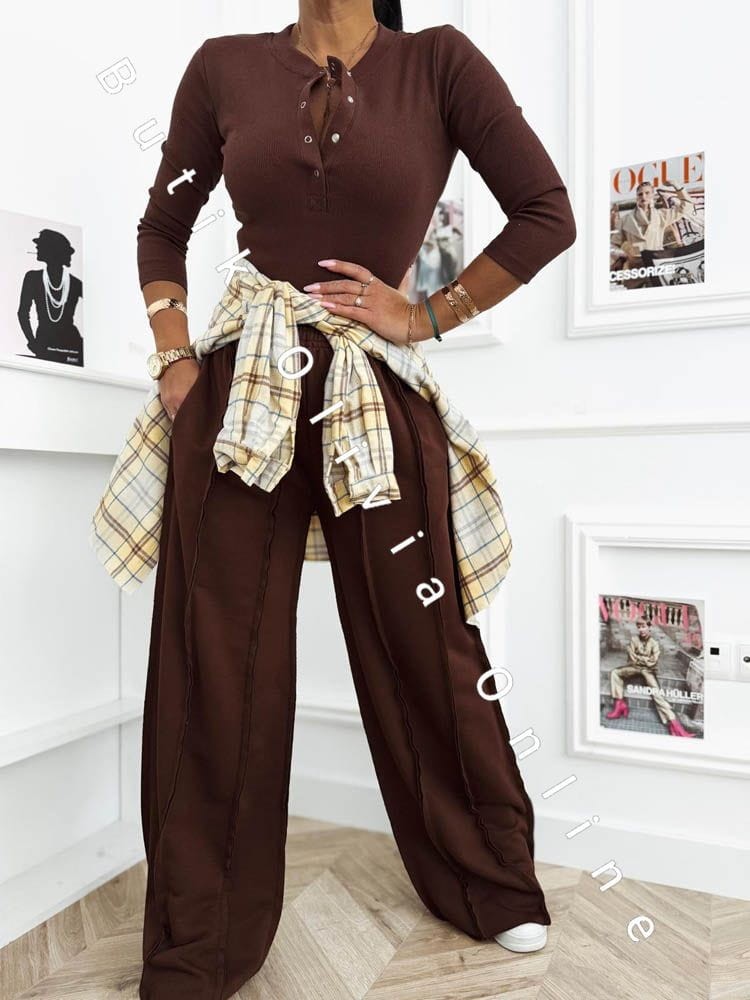 Das schokoladenbraune Set ist die perfekte Wahl für Frauen, die warme, edle Farbtöne und zeitlosen Stil mit einem modernen Akzent lieben. Der tiefe Braunton schmeichelt dem Teint und verleiht dem Outfit eine luxuriöse Ausstrahlung – ganz ohne Aufwand. Die gerippte Bluse mit Druckknopf-Dekolleté modelliert die Silhouette dezent und bietet vielseitige Styling-Möglichkeiten – von lässig bis sinnlich. Die weite Hose sorgt für Leichtigkeit, hohen Tragekomfort und entspricht den aktuellen Trends urbaner Eleganz. Ein Damen-Set, das sich sowohl im Alltag als auch für stilvollere Looks eignet – kombiniert mit Stiefeletten, Sneakern oder feinem Schmuck.