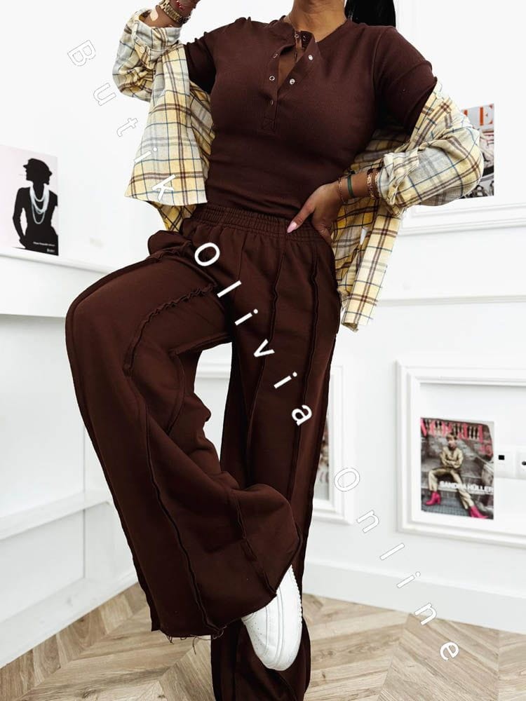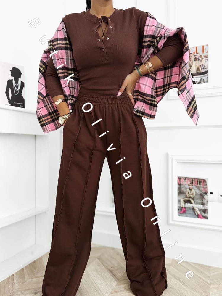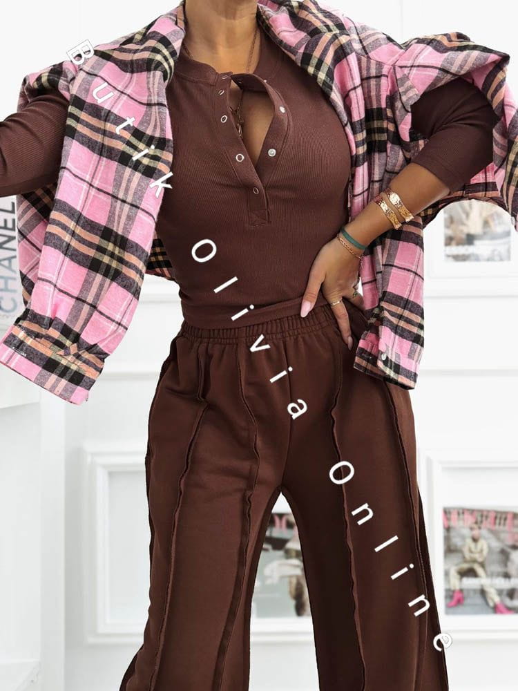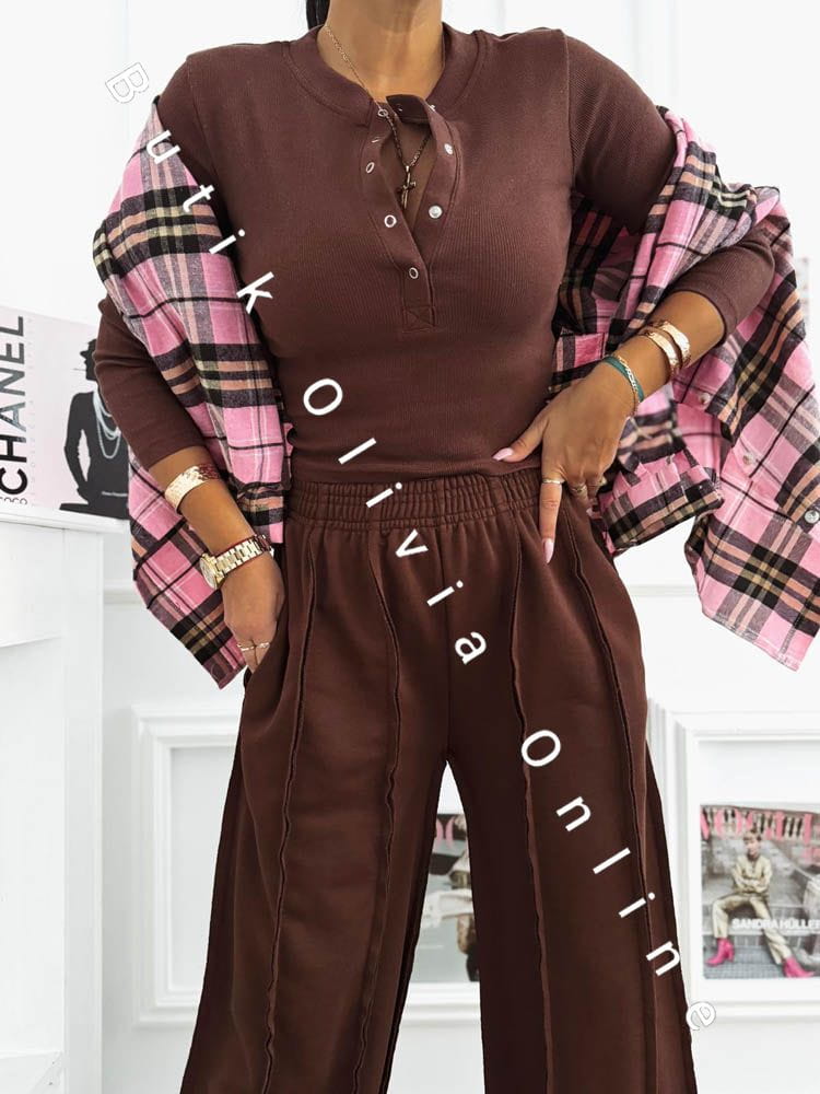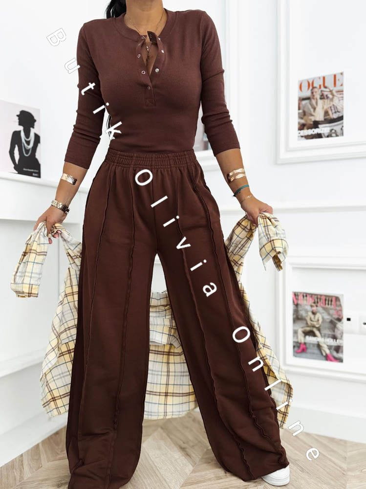Das schokoladenbraune Set ist die perfekte Wahl für Frauen, die warme, edle Farbtöne und zeitlosen Stil mit einem modernen Akzent lieben. Der tiefe Braunton schmeichelt dem Teint und verleiht dem Outfit eine luxuriöse Ausstrahlung – ganz ohne Aufwand. Die gerippte Bluse mit Druckknopf-Dekolleté modelliert die Silhouette dezent und bietet vielseitige Styling-Möglichkeiten – von lässig bis sinnlich. Die weite Hose sorgt für Leichtigkeit, hohen Tragekomfort und entspricht den aktuellen Trends urbaner Eleganz. Ein Damen-Set, das sich sowohl im Alltag als auch für stilvollere Looks eignet – kombiniert mit Stiefeletten, Sneakern oder feinem Schmuck.