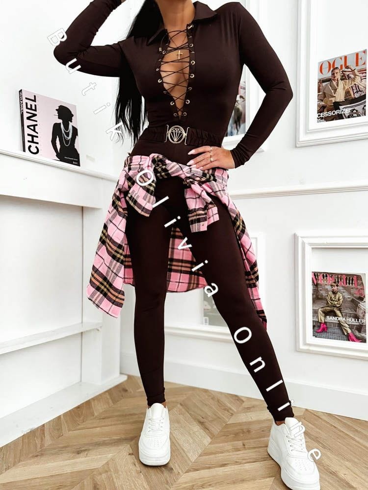 Dieser schokoladenfarbene Jumpsuit ist die perfekte Kombination aus Sinnlichkeit und Eleganz in einem modernen Design. Der tiefe Braunton unterstreicht den Teint auf wunderschöne Weise und wirkt besonders luxuriös. Der figurbetonte Schnitt formt die Silhouette, während der geschnürte Ausschnitt mit metallischen Ösen alle Blicke auf sich zieht und es ermöglicht, die Tiefe des Dekolletés individuell an deinen Stil anzupassen. Abgerundet wird das Design durch einen angenähten Gürtel mit goldener Schnalle, der die Taille betont und dem Jumpsuit einen hochwertigen Premium-Charakter verleiht. Ein Schnitt, der Eindruck macht – ganz gleich zu welchem Anlass.