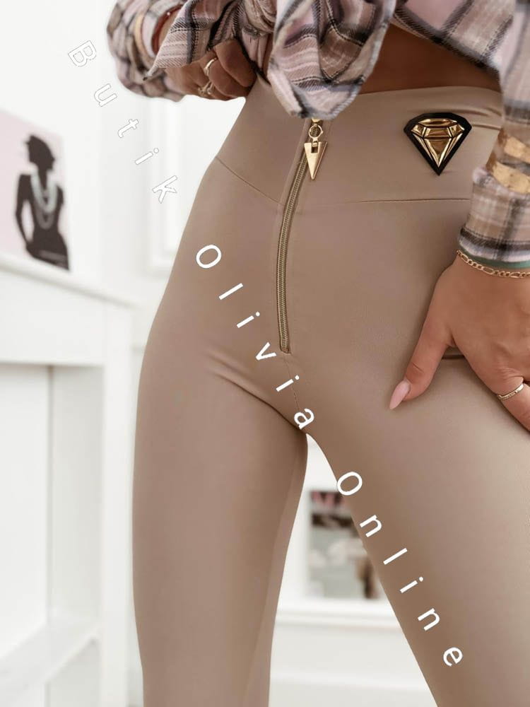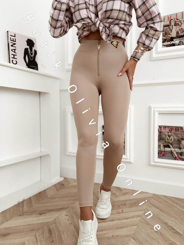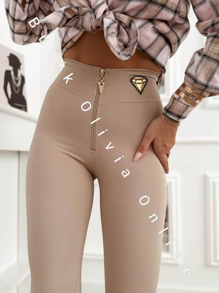 Diese beigen High-Waist-Leggings vereinen minimalistisches Design mit maximalem Figurform-Effekt. Sie passen sich perfekt dem Körper an, betonen Hüften und Po, während das elastische, glatte Material den ganzen Tag über für hohen Tragekomfort sorgt. Der hohe Bund setzt die Taille wunderschön in Szene, und der dekorative Reißverschluss vorne sowie eine dezente Applikation in Diamantform verleihen dem Look Charakter und einen modischen Akzent. Diese Leggings eignen sich sowohl für Alltagslooks mit Hemd oder Pullover als auch für eine femininere Variante mit engem Top oder Body. Der neutrale, beige Farbton streckt optisch die Beine und harmoniert perfekt mit hellen sowie pastelligen Stylings – für ein stimmiges, elegantes Gesamtbild.