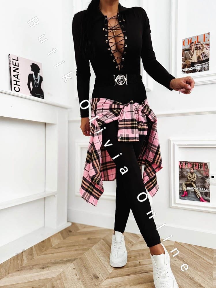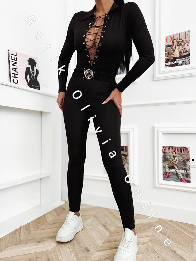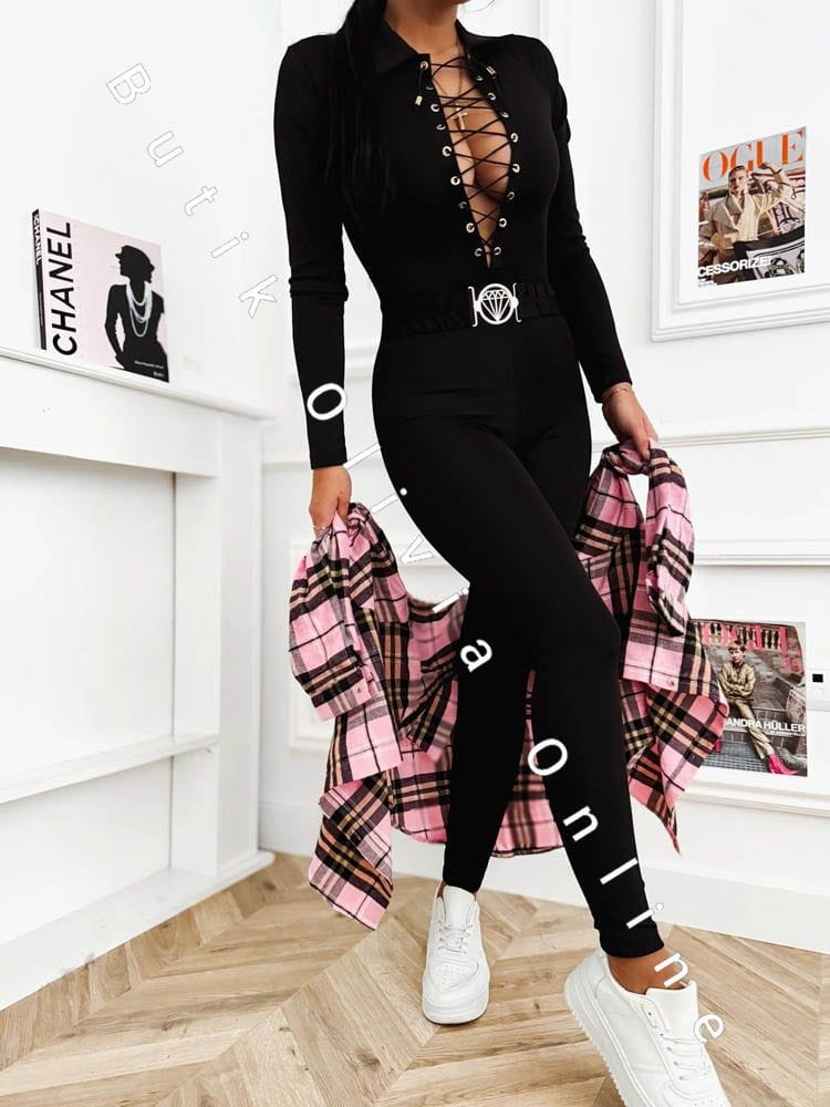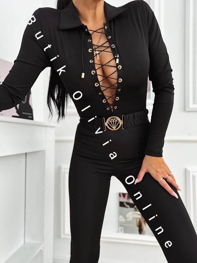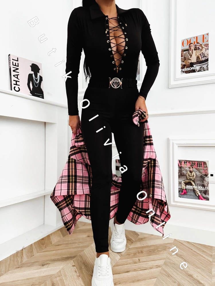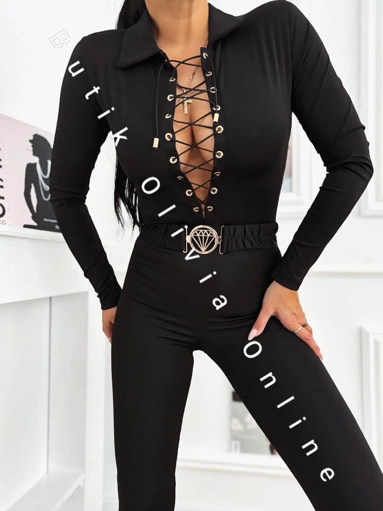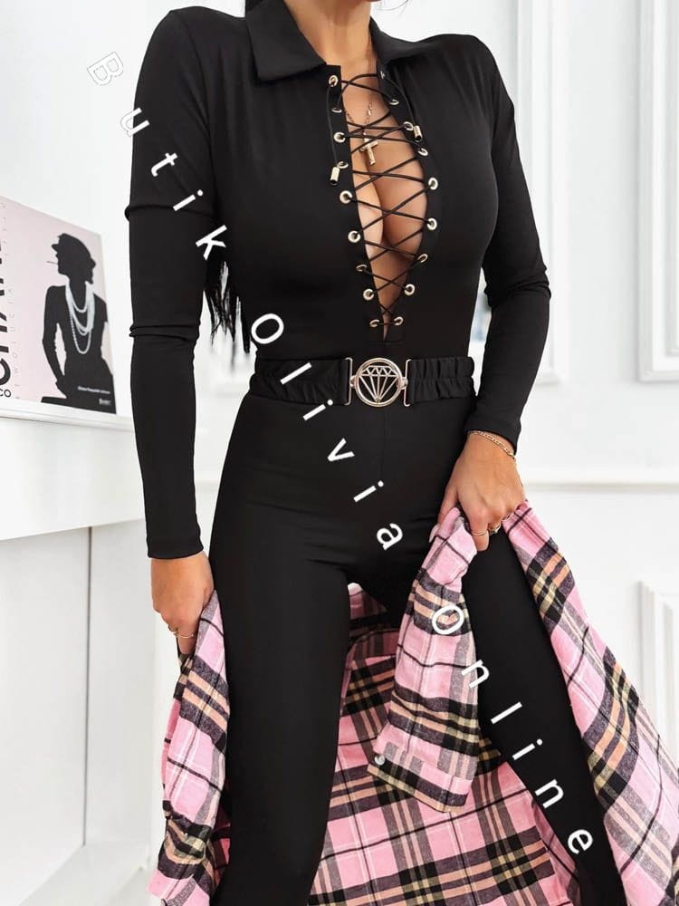 Dieser schwarze Overall mit geschnürtem Ausschnitt ist ein fertiges Styling, das ohne Aufwand einen echten WOW-Effekt erzielt. Der figurbetonte Schnitt betont die Silhouette wunderschön, während der tiefe Schnürausschnitt (mit Metallösen) Charakter verleiht und es dir ermöglicht, die Tiefe individuell zu regulieren. Das i-Tüpfelchen ist der fest angenähte Gürtel mit goldener Schnalle, der die Taille betont und dem Ganzen ein luxuriöses Finish verleiht. Mit Sneakern entsteht ein starker Look für den Alltag, mit High Heels ein perfektes Abend-Outfit.