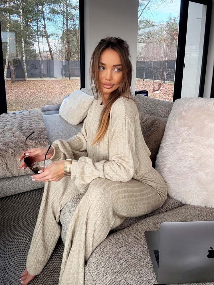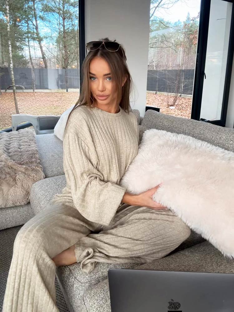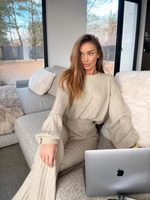 Dieses stilvolle Strickset in einem eleganten Beigeton ist die perfekte Wahl für Frauen, die Komfort, Minimalismus und einen modischen Look in jeder Situation schätzen. Gefertigt aus weicher, angenehm zu tragender Strickware mit gerippter Struktur bietet es hohen Tragekomfort und passt sich der Silhouette optimal an. Das locker geschnittene Oberteil mit langen Ärmeln und dezent überschnittener Schulterlinie fällt wunderschön am Körper und verleiht dem Look Leichtigkeit sowie einen modernen Charakter. Die Hose mit elastischem Bund und geradem, leicht ausgestelltem Bein streckt optisch die Beine und sorgt für maximale Bewegungsfreiheit. Zusammen ergibt sich ein harmonischer, trendiger Look – ideal sowohl für Zuhause als auch für Ausgänge. Der neutrale Beigeton macht das Set besonders vielseitig und zeitlos und lässt sich mühelos mit hellen Accessoires, Sneakers, Stiefeletten oder einer minimalistischen Tasche kombinieren.